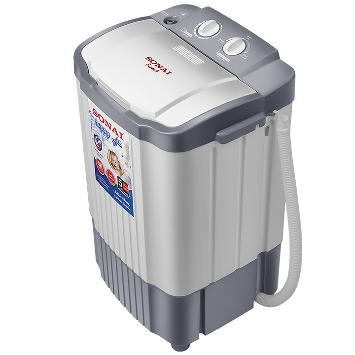 غسالة سوناي بسعة غسيل 4كجم، مزودة بمؤقت للغسيل، وموتور قوي بقدرة 170 وات للغسيل الثقيل والخفيف، ومصنعة من خامات مقاومة للبكتيريا لتجربة غسيل صحية وفعالة.
